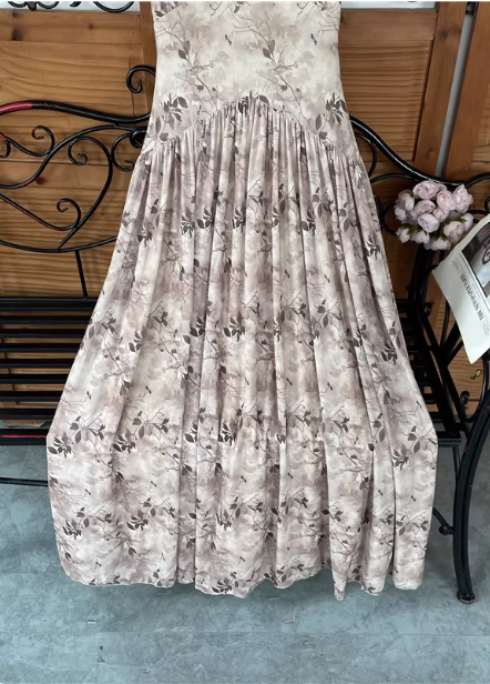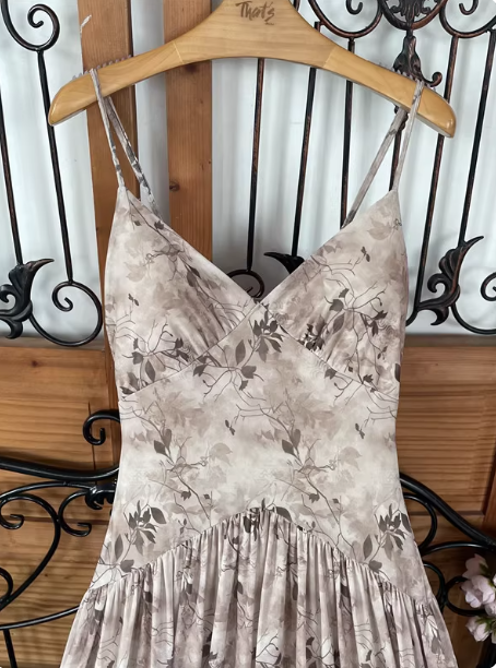 Beautiful Milk Tea Color Spaghetti Strap V-neck Printed Satin Long Prom Dress Evening Dress P4538