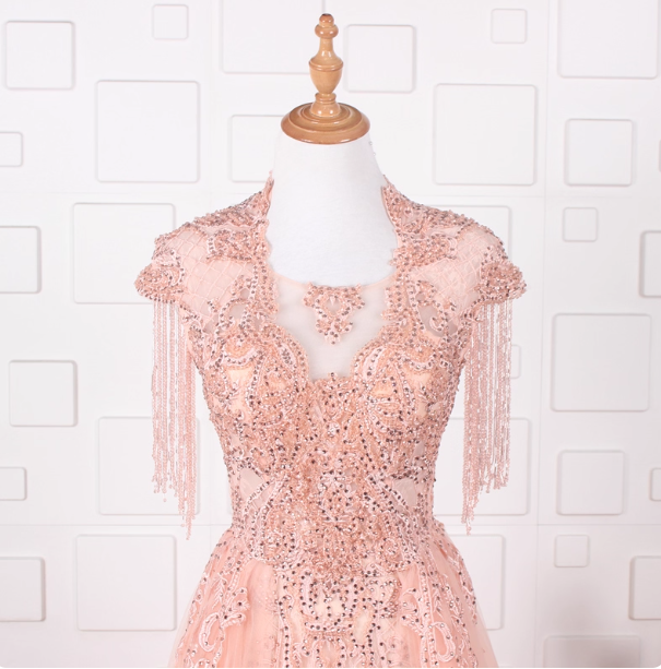 Elegant Court Grey Fringed Beaded Embroidered Tulle Train Prom Dress Evening Dress P4554
