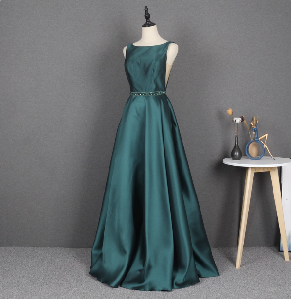 Elegant Dark Green A-line Sleeveless Rhinestone Satin Long Prom Dress Evening Dress P4561