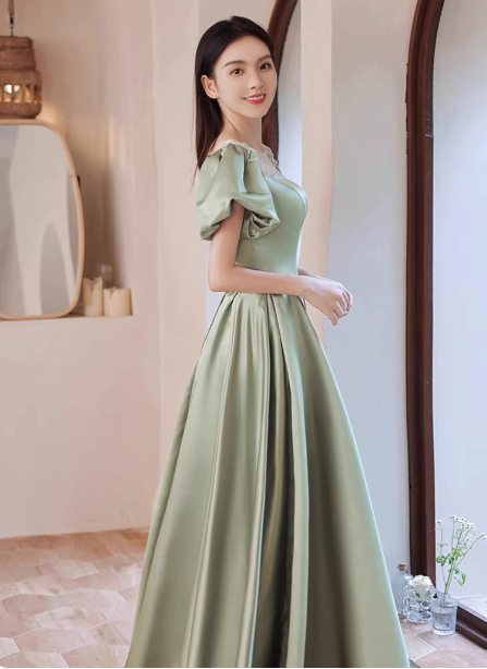 Elegant Green A-line Puff Sleeve Satin Long Prom Dress Evening Dress Bridesmaid DressP4574