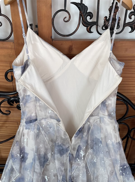 Elegant Printed Spaghetti Strap V-neck Ruffled Layered Tulle Prom Dress P4525