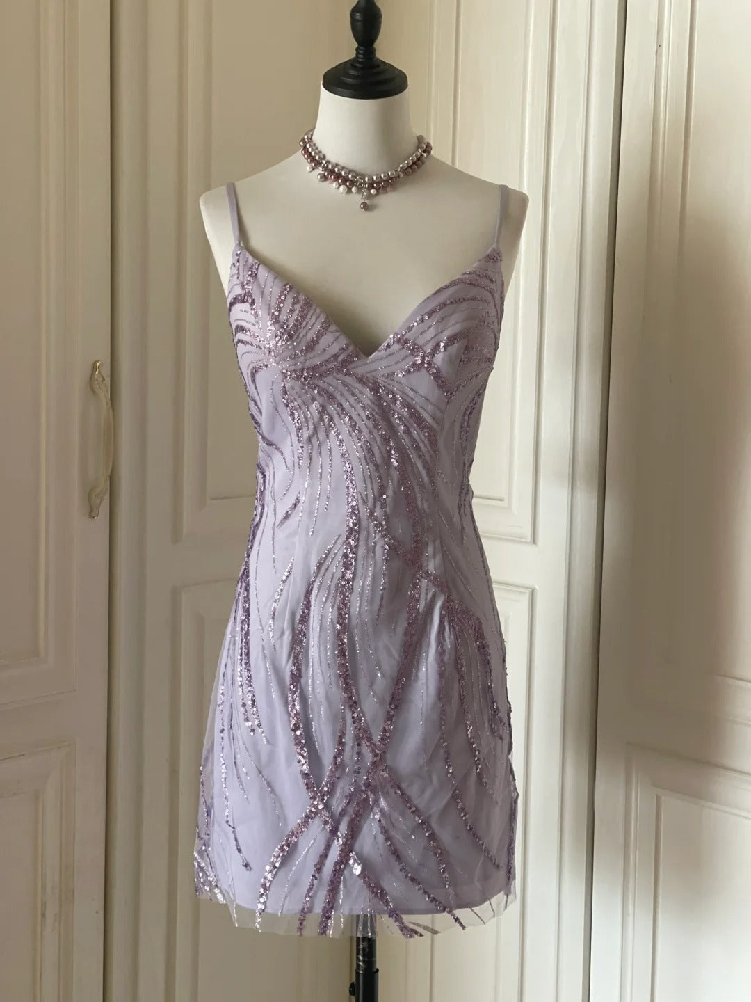 Elegant V-neck Purple Sequin Spaghetti Strap Mini Homecoming Dress P3505