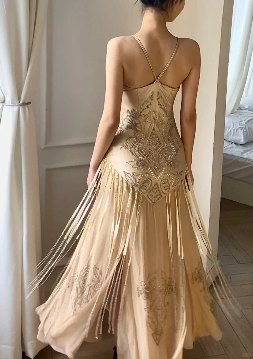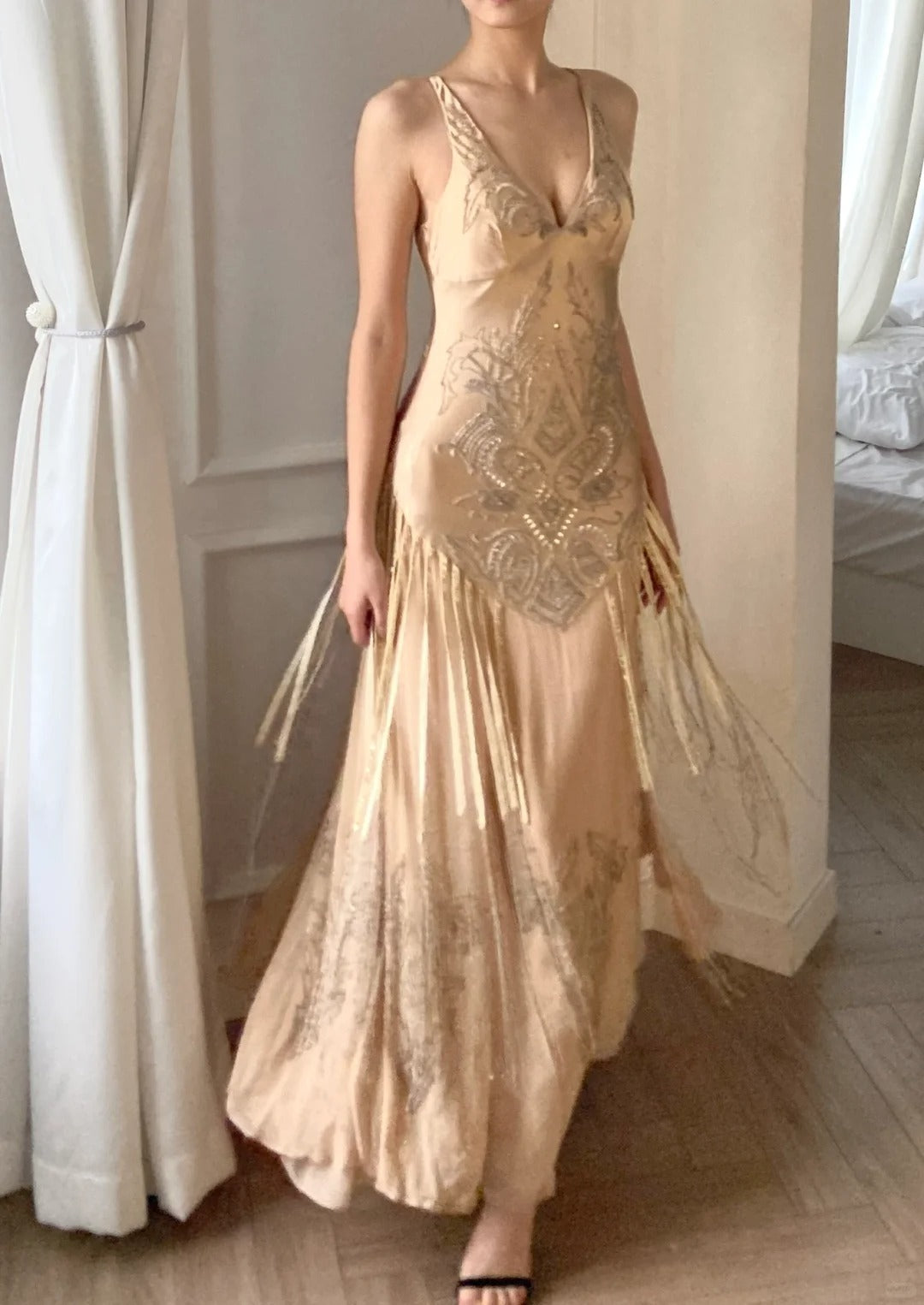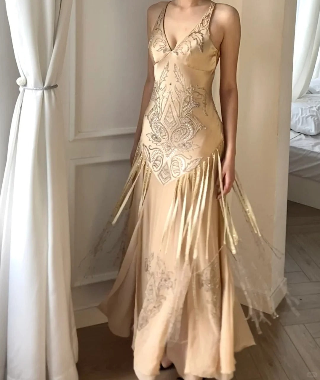 Flowing Champagne V-Neck Beaded Chiffon Tassel Prom Dress P3492
