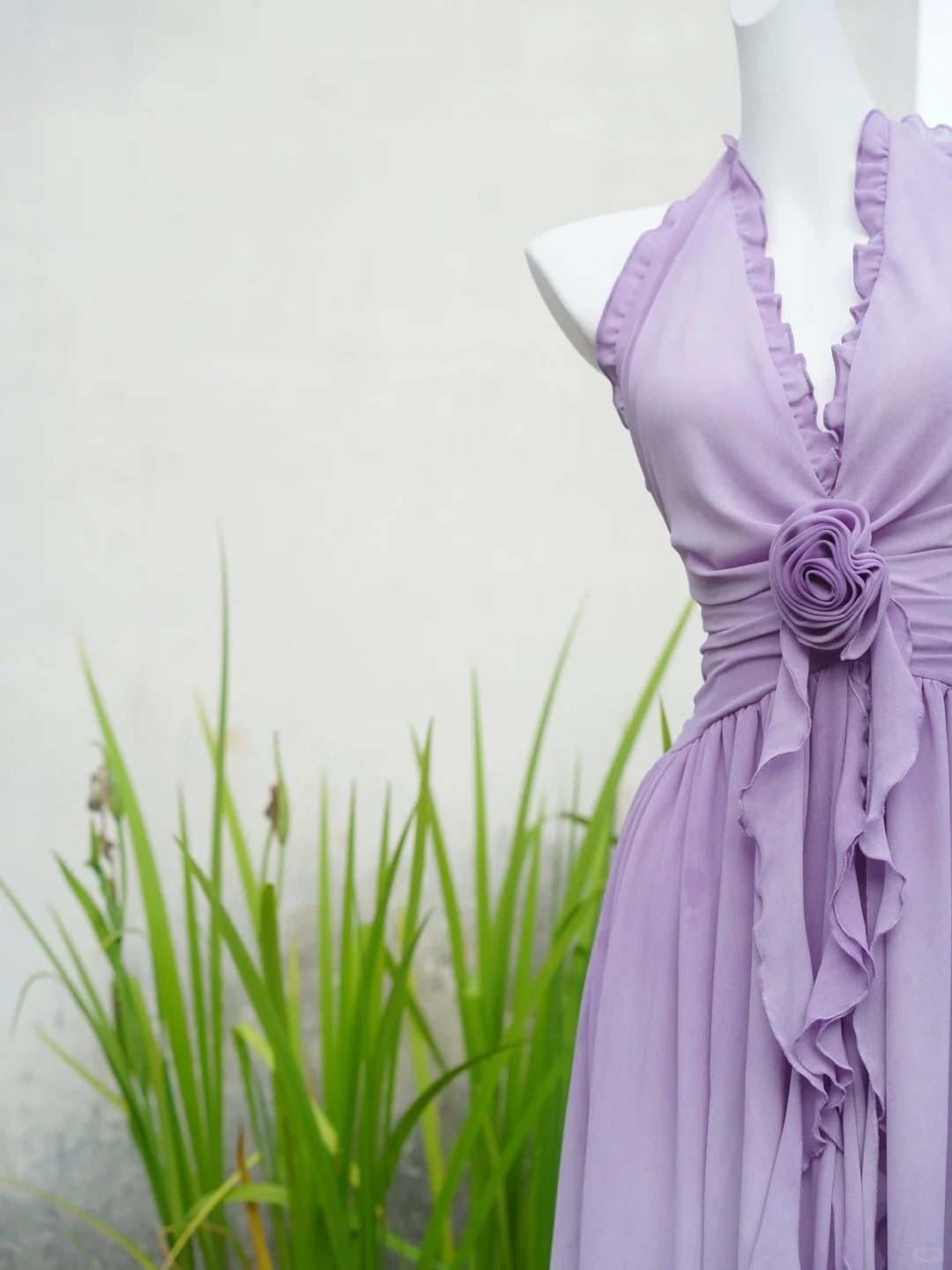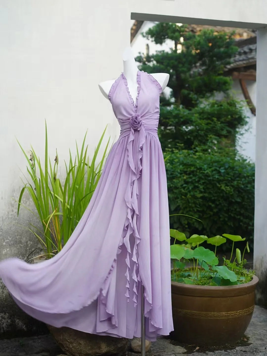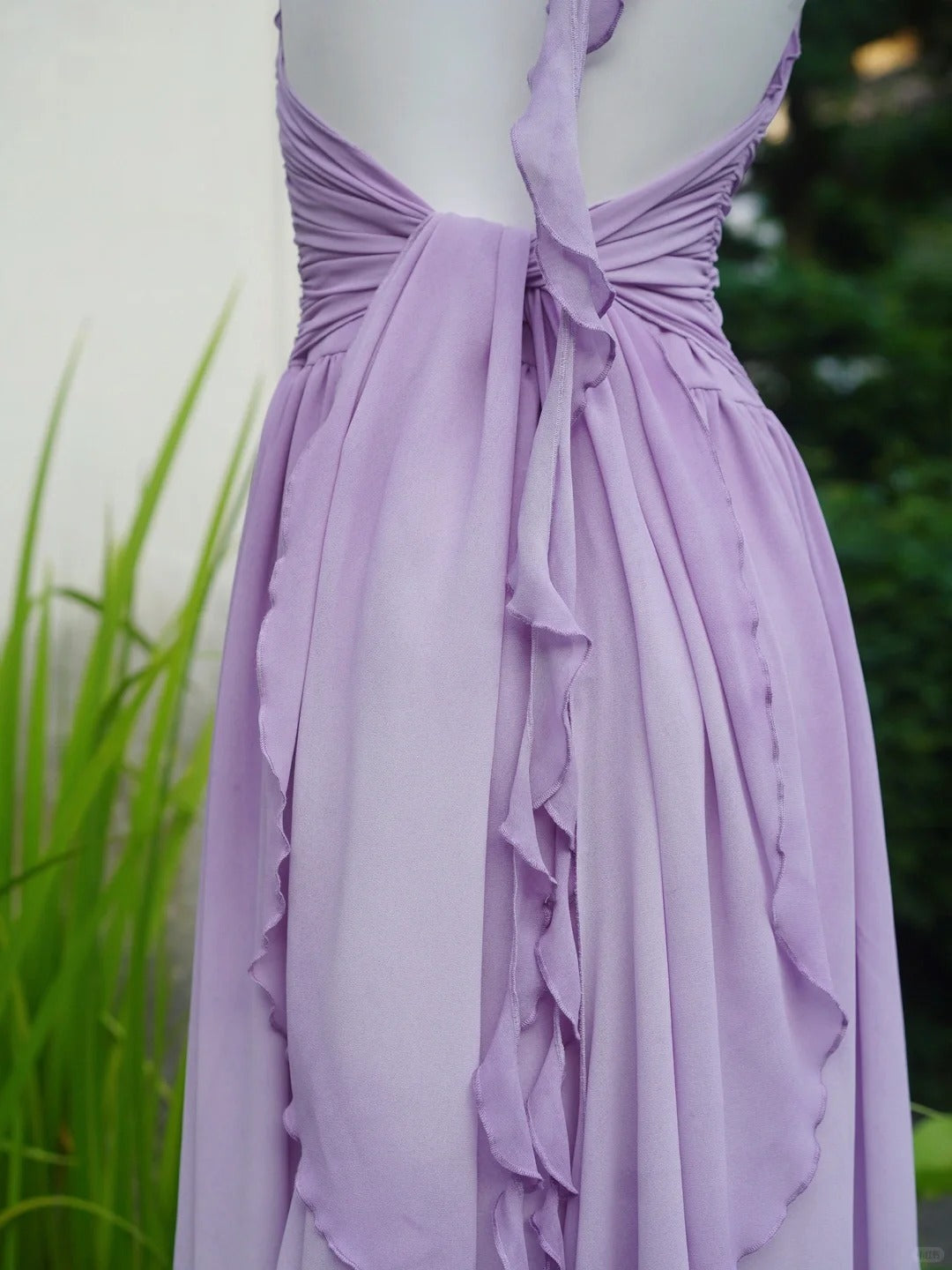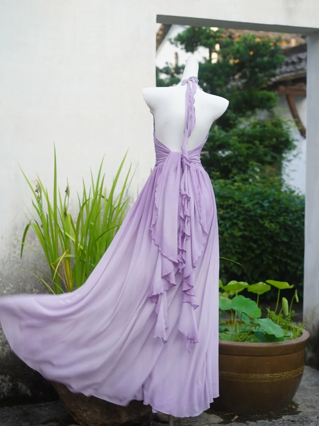 Flowing Chiffon Backless Purple Halter Neck Ruffled Long Prom Dress P3459