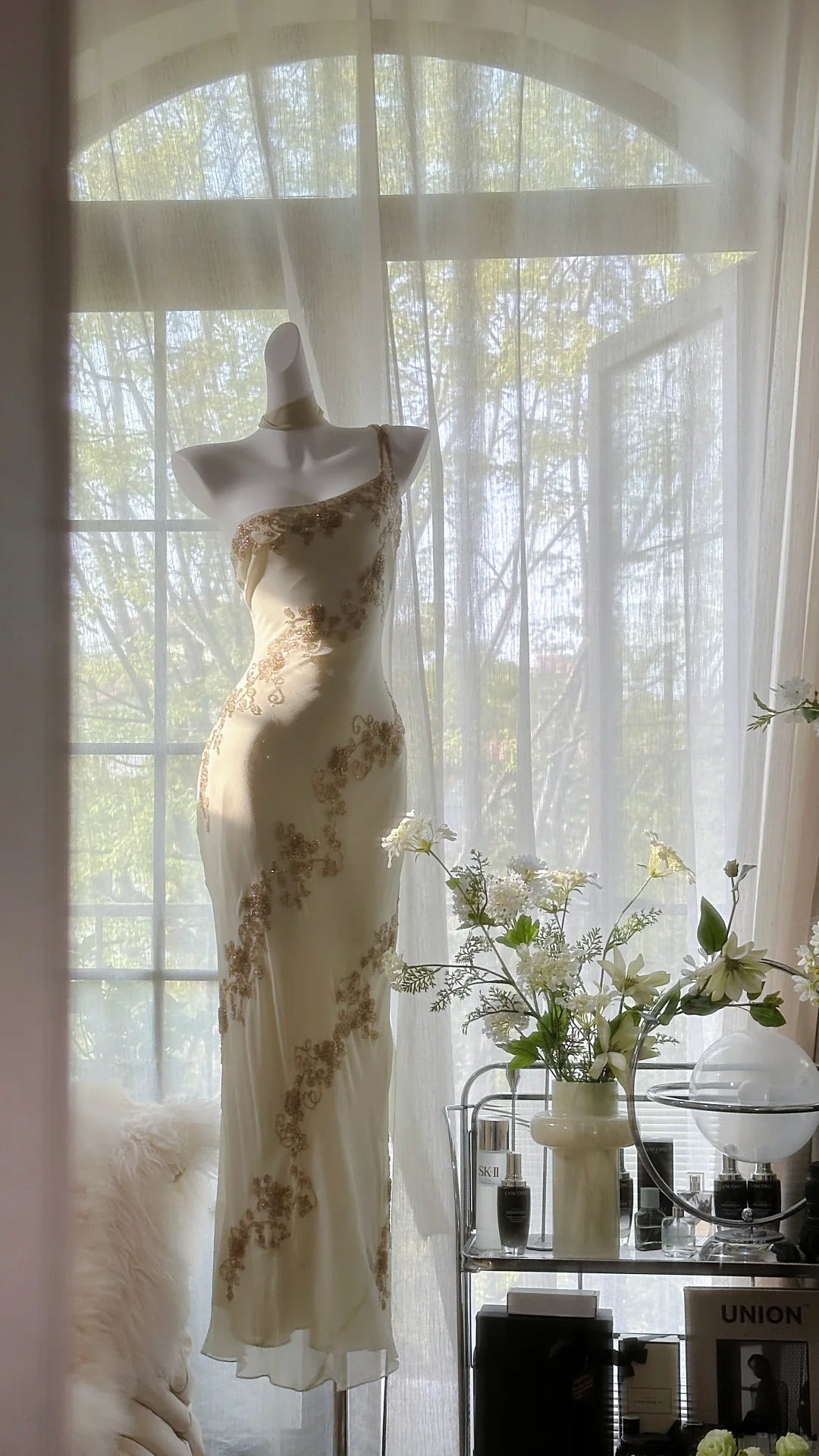 Flowy One Shoulder Chiffon Beaded Elegant Prom Dress P3283