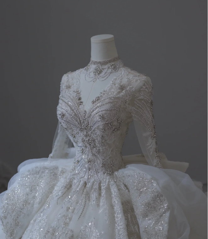 French Palace V-neck long-sleeved dreamy and shiny floor-length wedding dress P2610