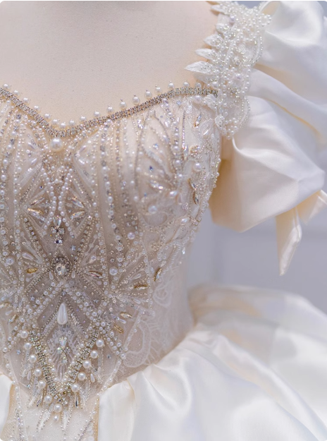 French Princess Satin Puff Sleeve Beaded White Floor-Length Wedding Dress P2762