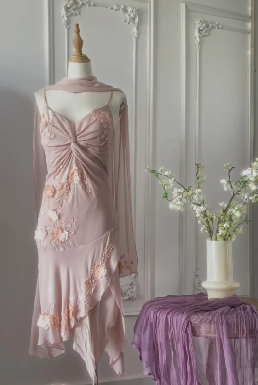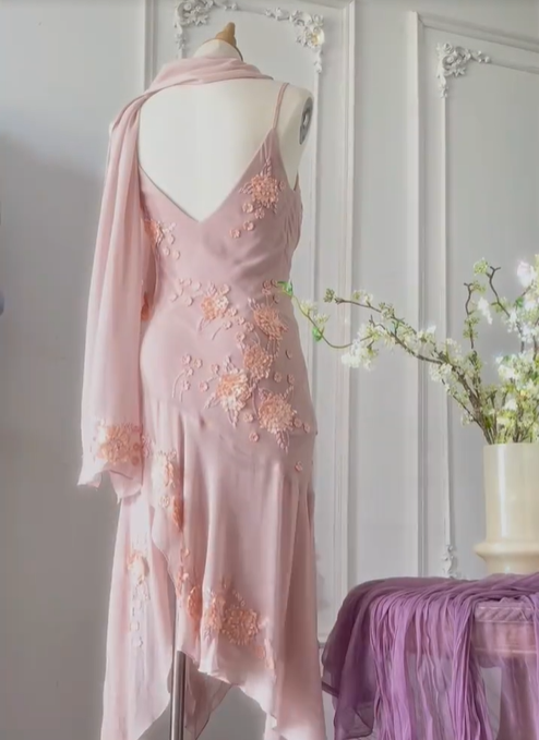 Gentle pink sling three-dimensional rose beaded chiffon irregular skirt homecoming dress P3147