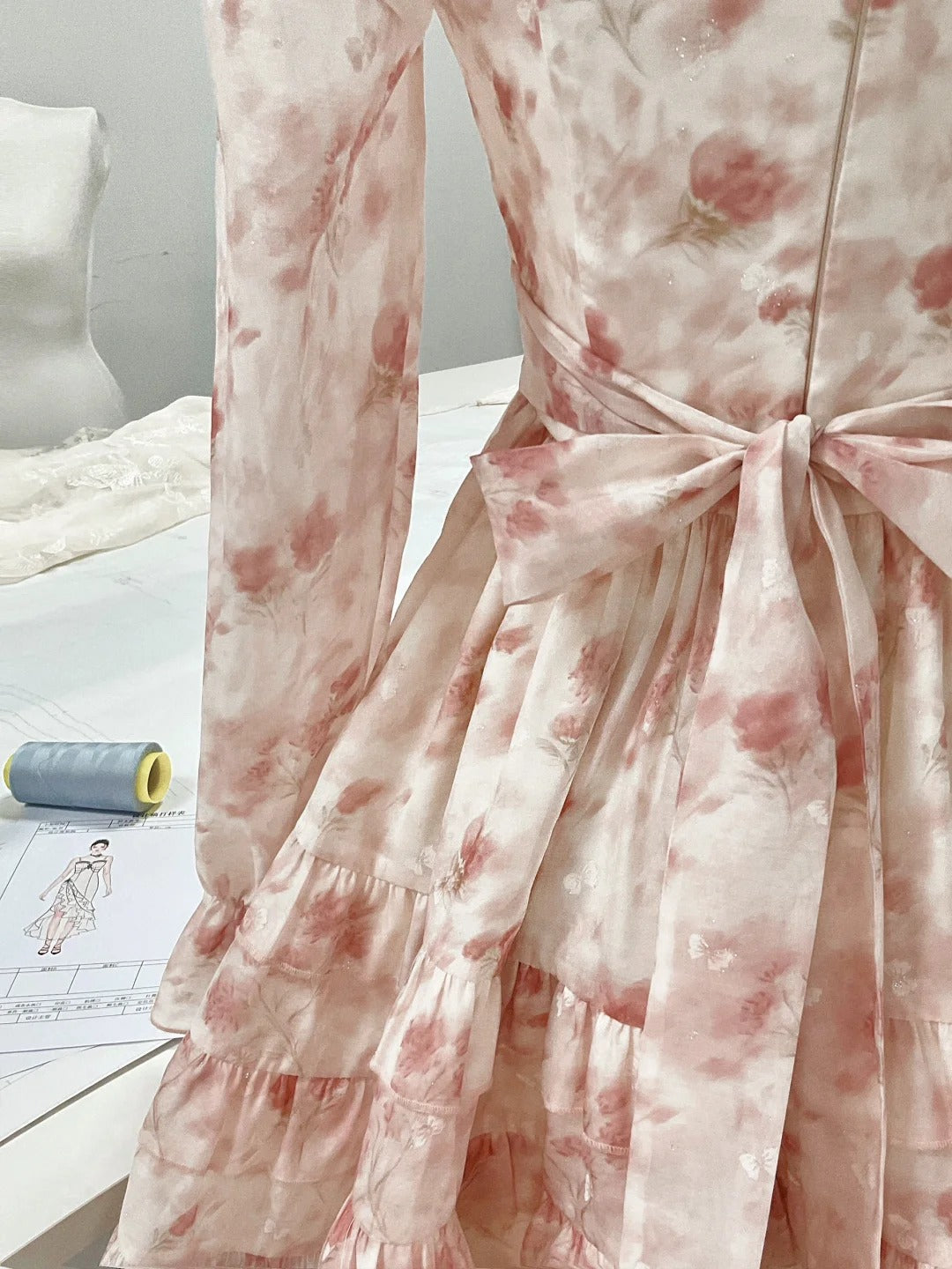 Girls Pink Square Neck Long Sleeve Printed Chiffon A-Line Homecoming Dress P3158