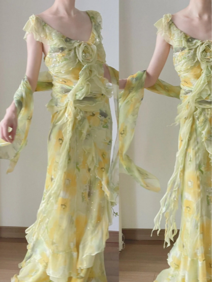 Light Yellow And Green V-neck Ruffled Chiffon Prom Dress P3803