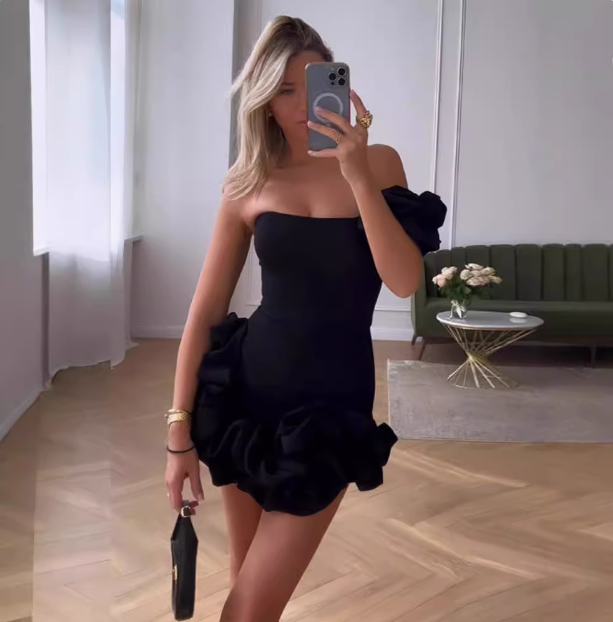 Lightweight black one-shoulder pleated slim homecoming dress P3187