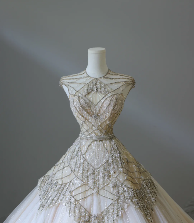 Luxurious Champagne Sleeveless Beaded Rhinestone A-Line Floor-Length Tulle Wedding Dress P2576