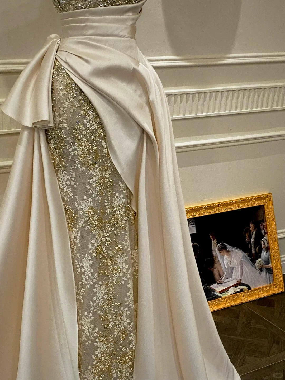 Luxury Slim-fit Strapless Lace Satin Train Prom Dress Evening Dress Wedding Dress P4088