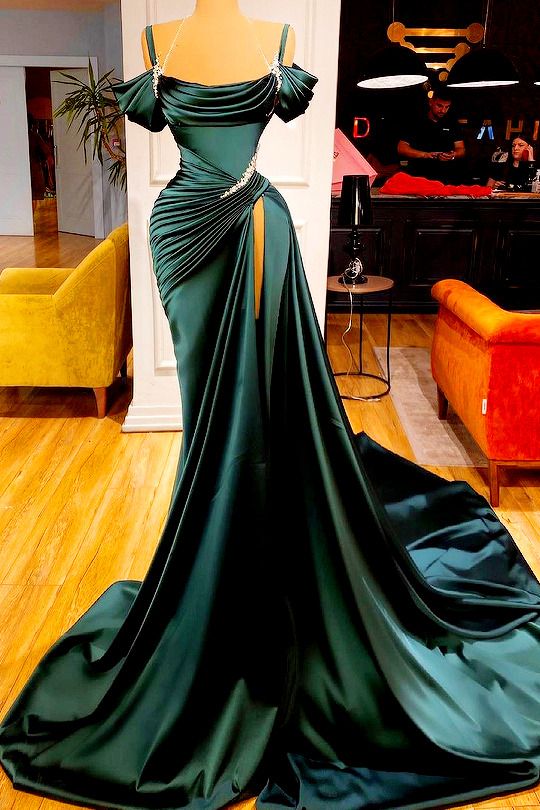 Mermaid Green Off-the-Shoulder Prom Dress Slit Long Prom Dresses P536