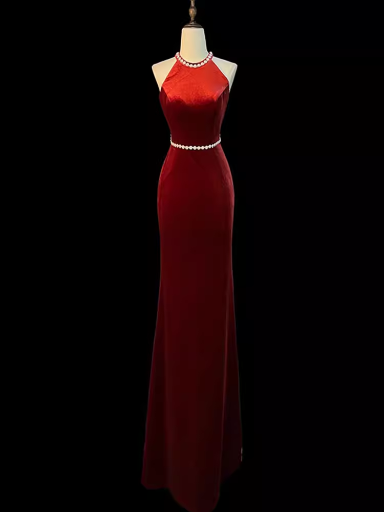 Mermaid Halter Burgundy Long Velvet Prom Dresses P1915