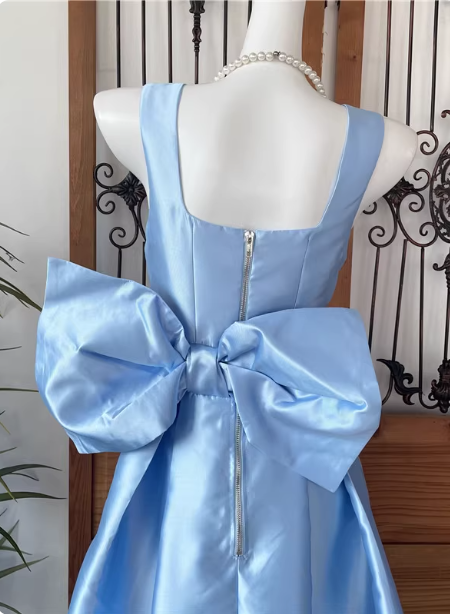 Princess Elegant Blue Square Neck Bow Satin Long Prom Dress Evening Dress P4545