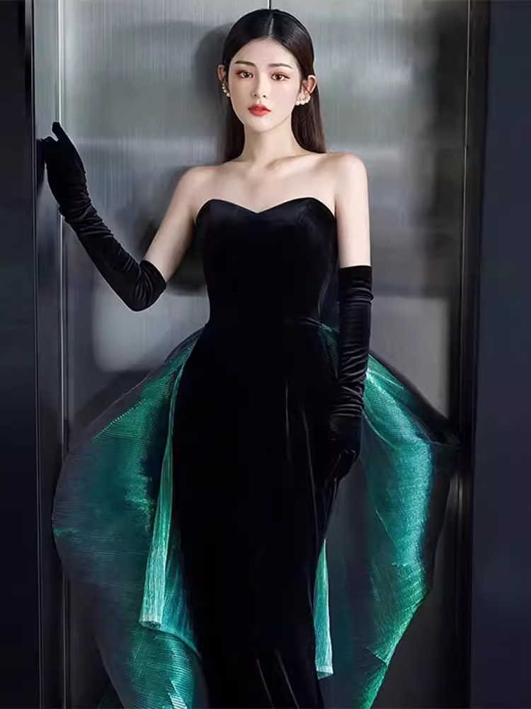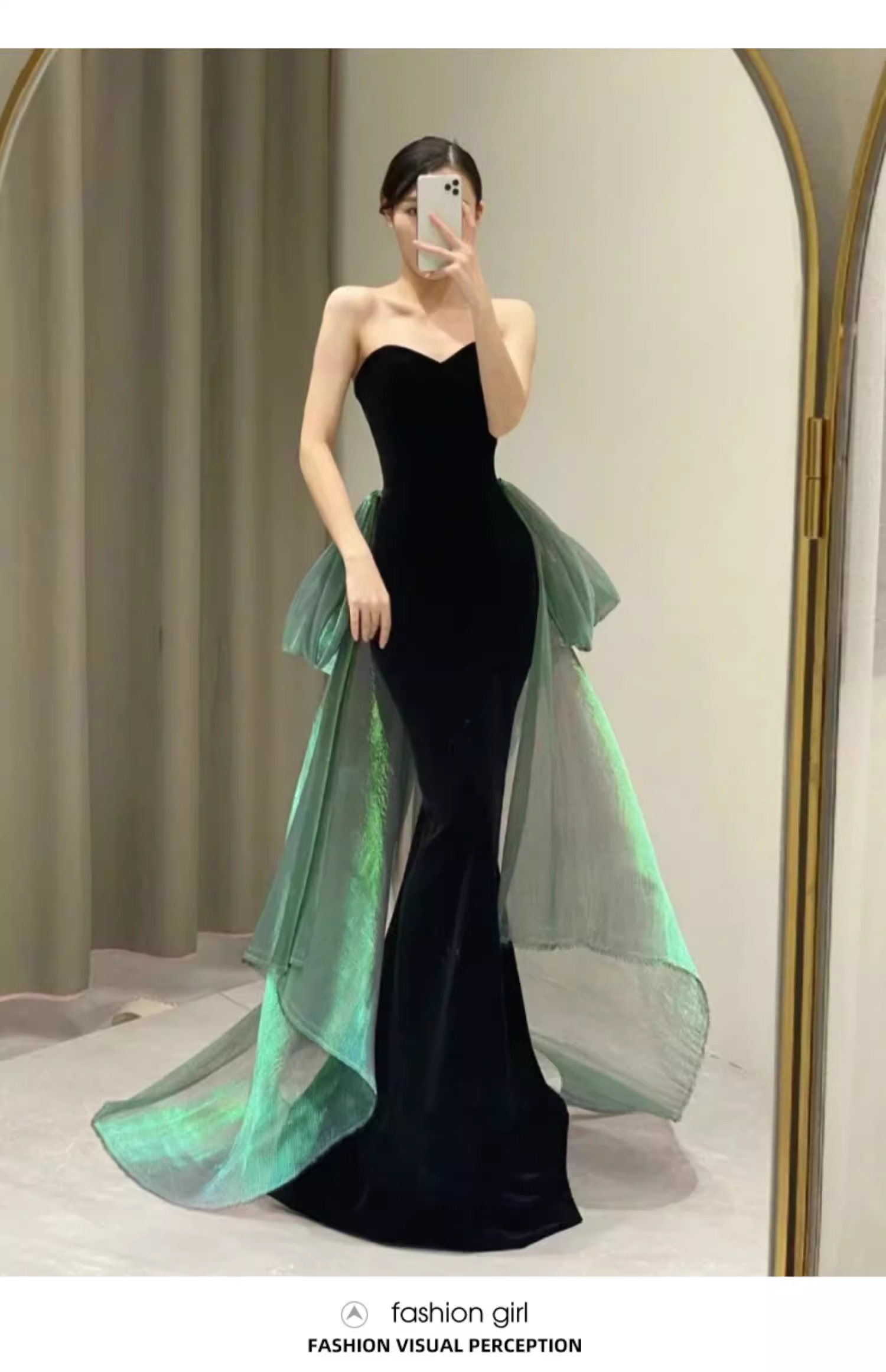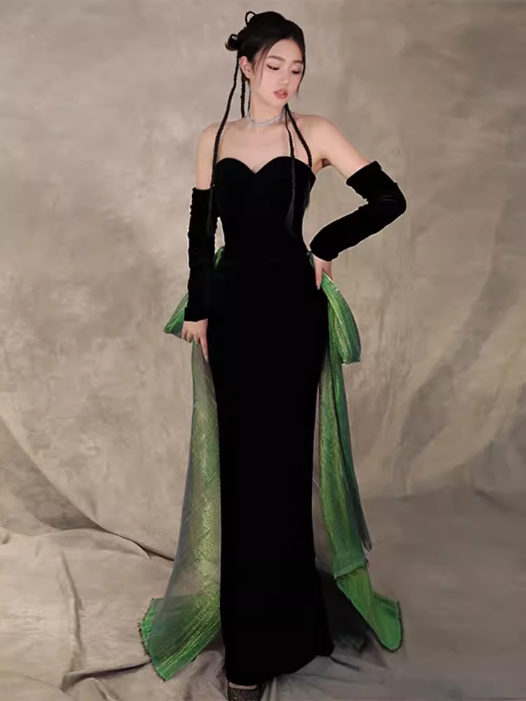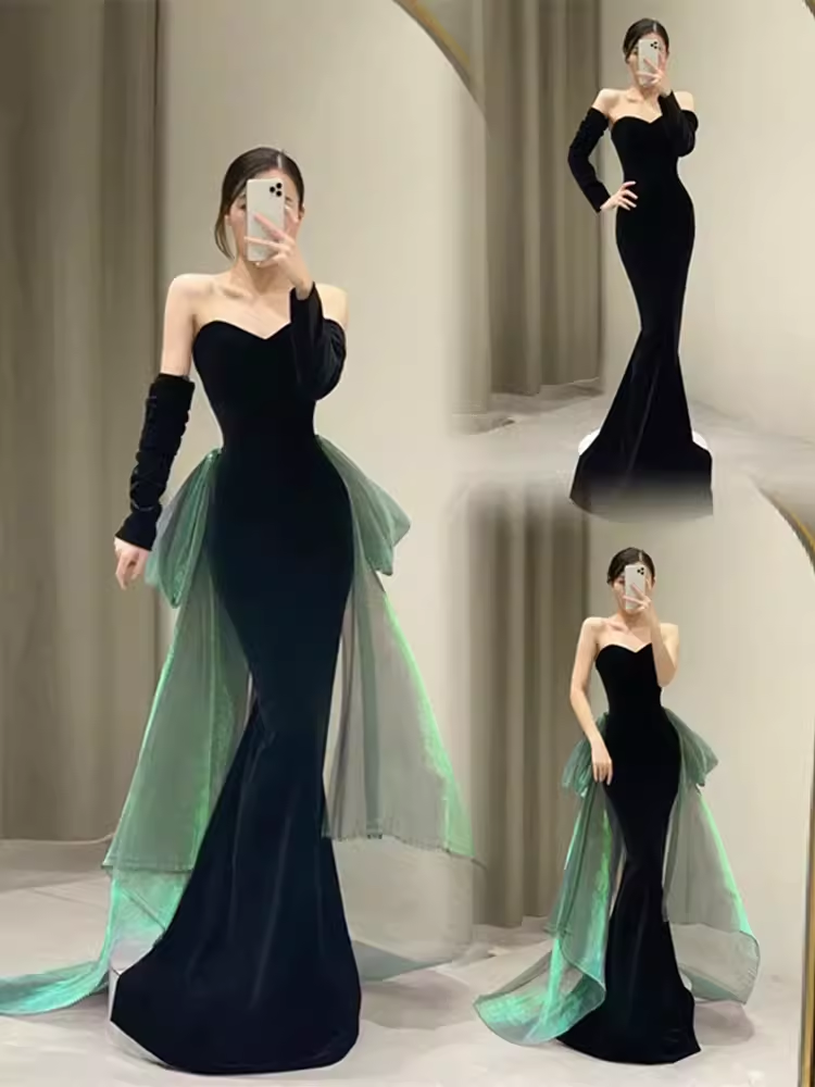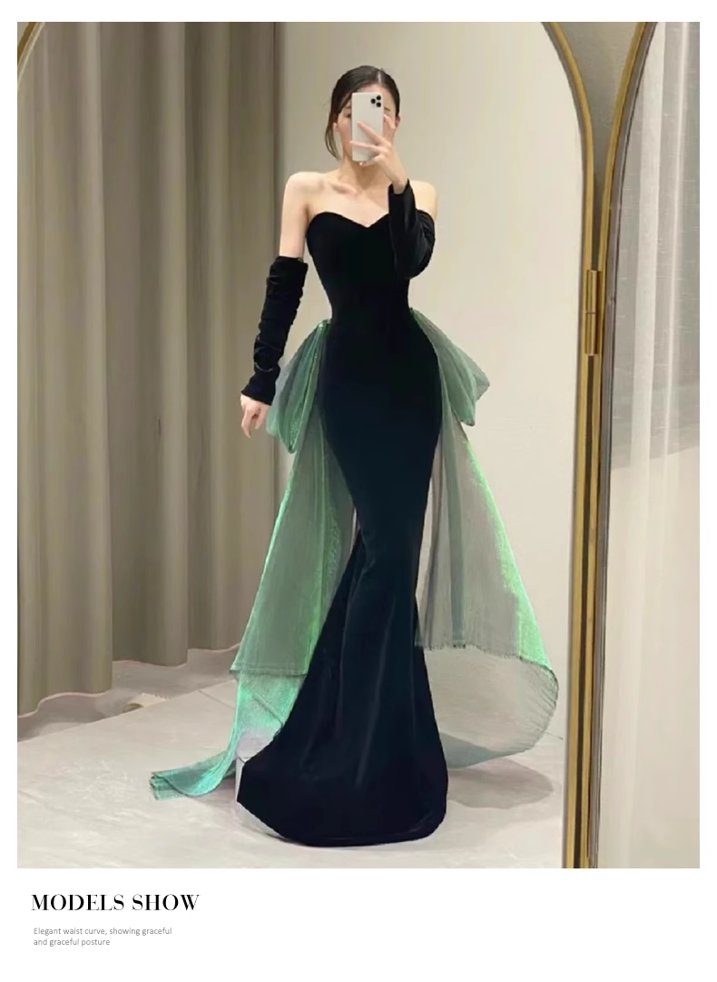 Sexy Mermaid Long Black Velvet Prom Dresses With Sleeves Long Prom Gown P474