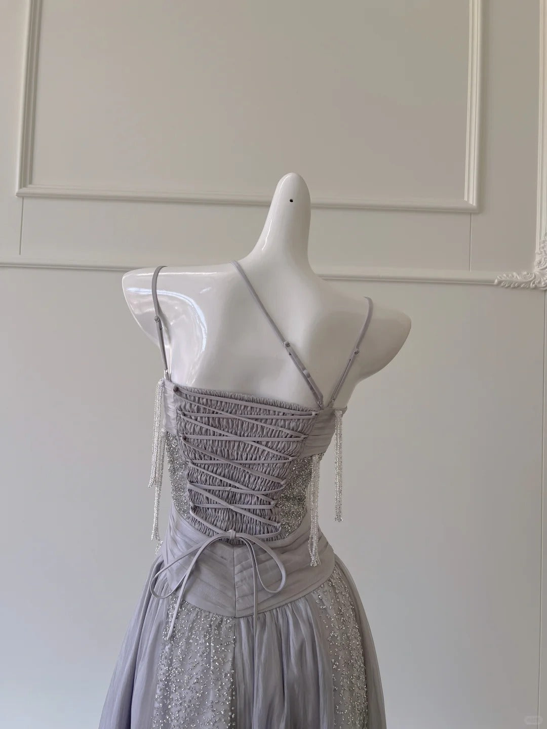 Sparkling A-line Strap Sequined Tassel Tulle Long Prom Dress Evening Dress P4060