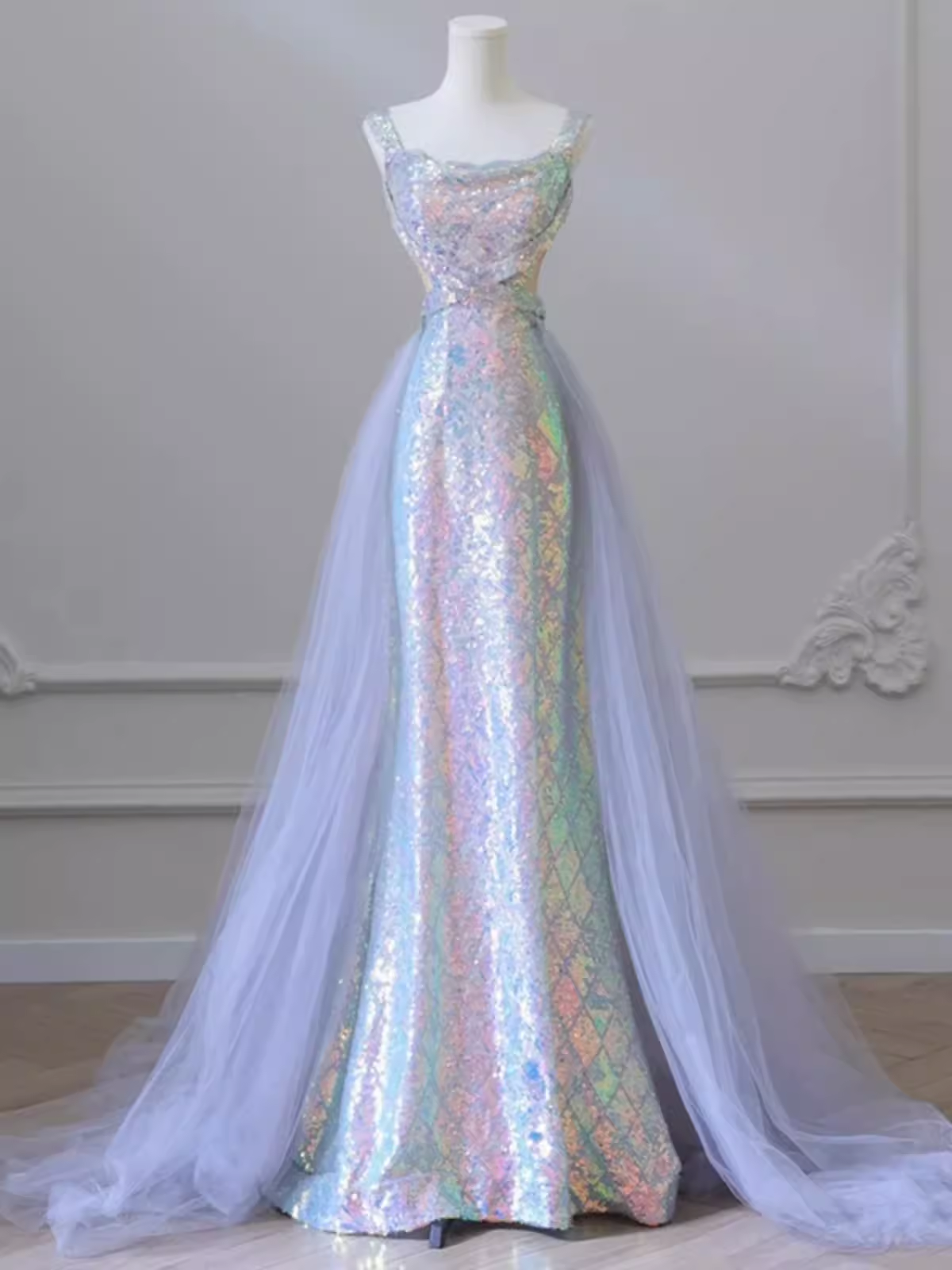 Sparkly Mermaid Sleeveless Sequin Light Sky Blue Long Prom Dress P524
