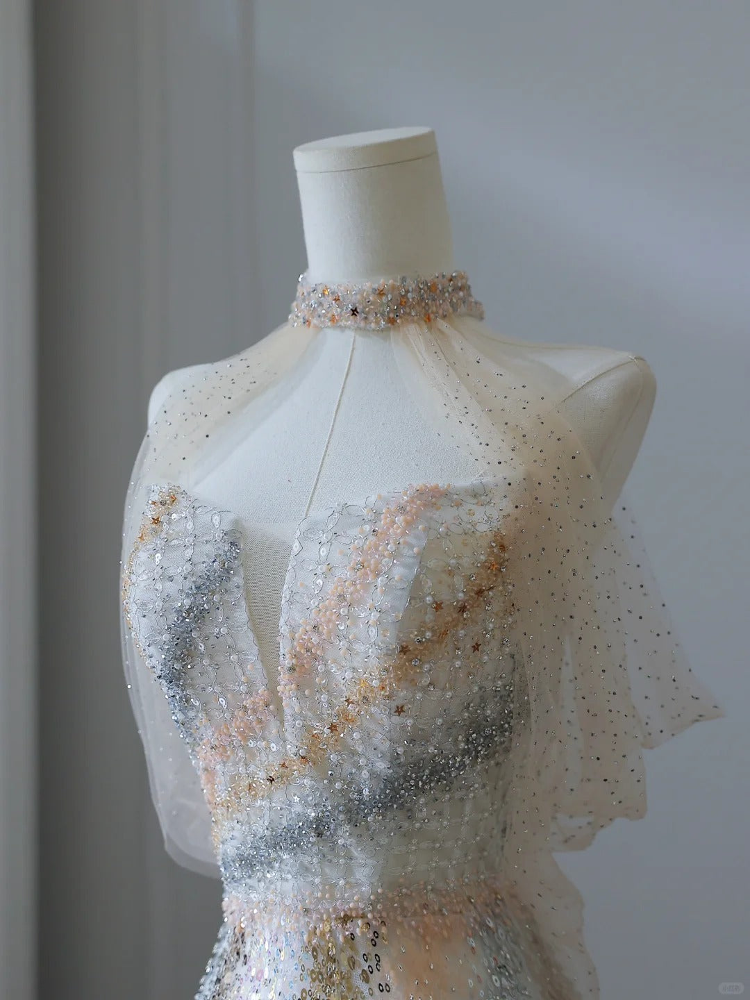 Unique and Elegant Colorblock Shiny Sequin Beaded Off-the-shoulder Floor-length Wedding Dress P2537