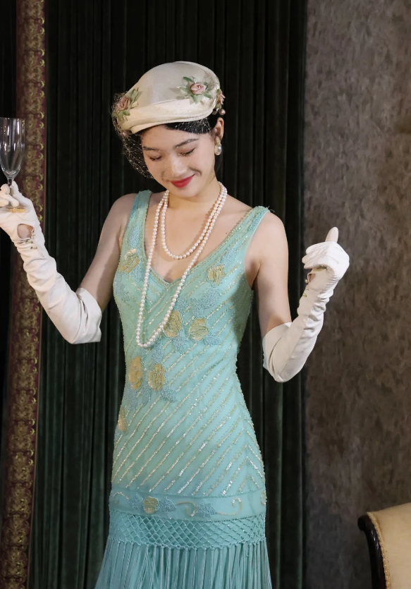 Vintage Blue Sleeveless V-Neck Tassel Beaded Chiffon Long Prom Dress Evening Dress P4888