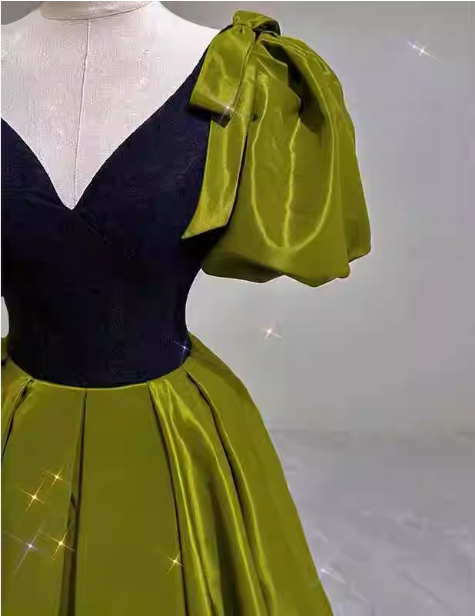 Vintage Green A-line V-neck Puff Sleeve Satin Long Prom Dress Evening Dress P4599